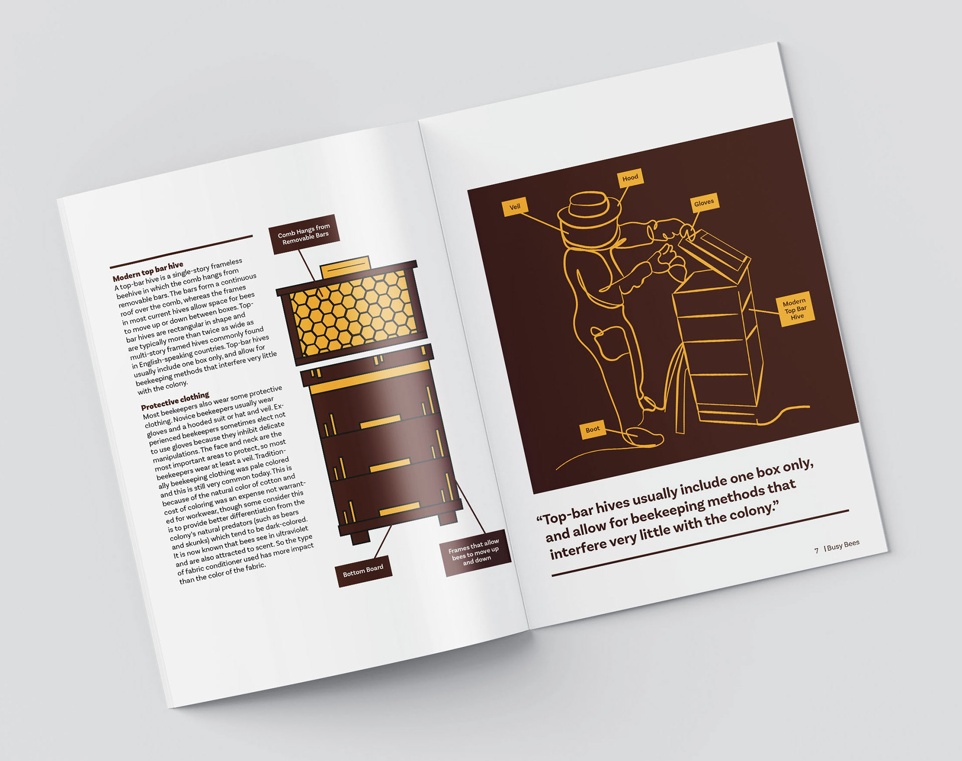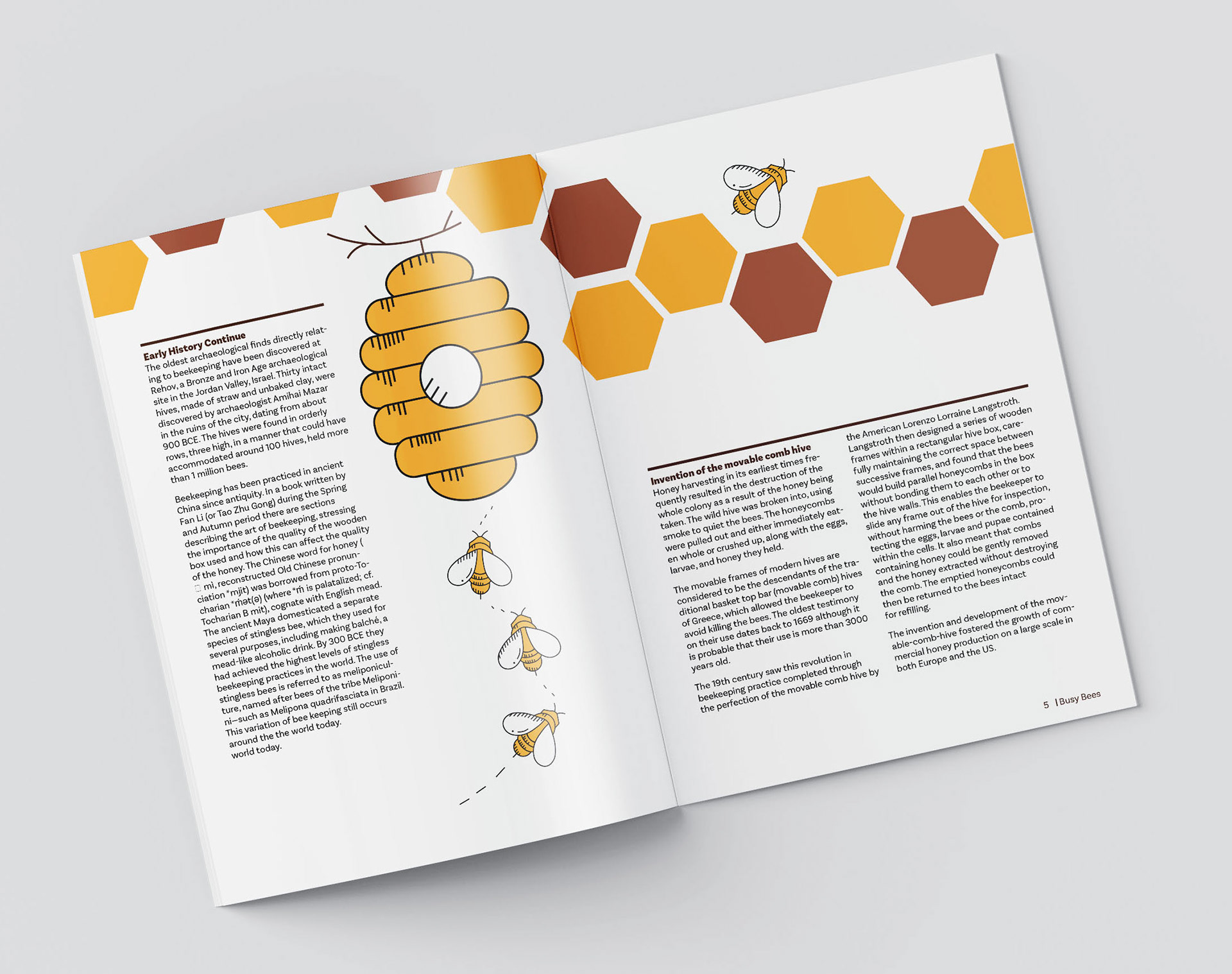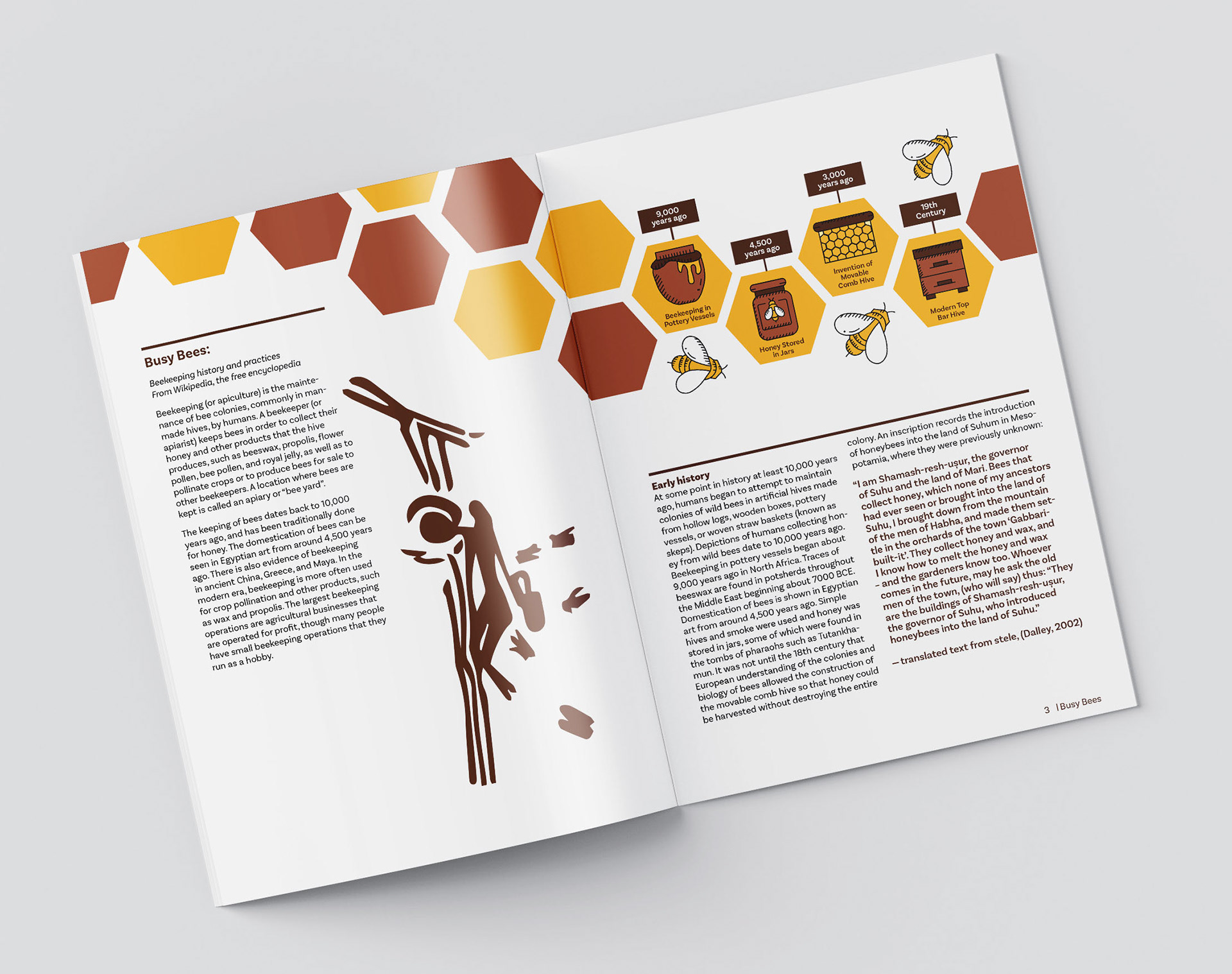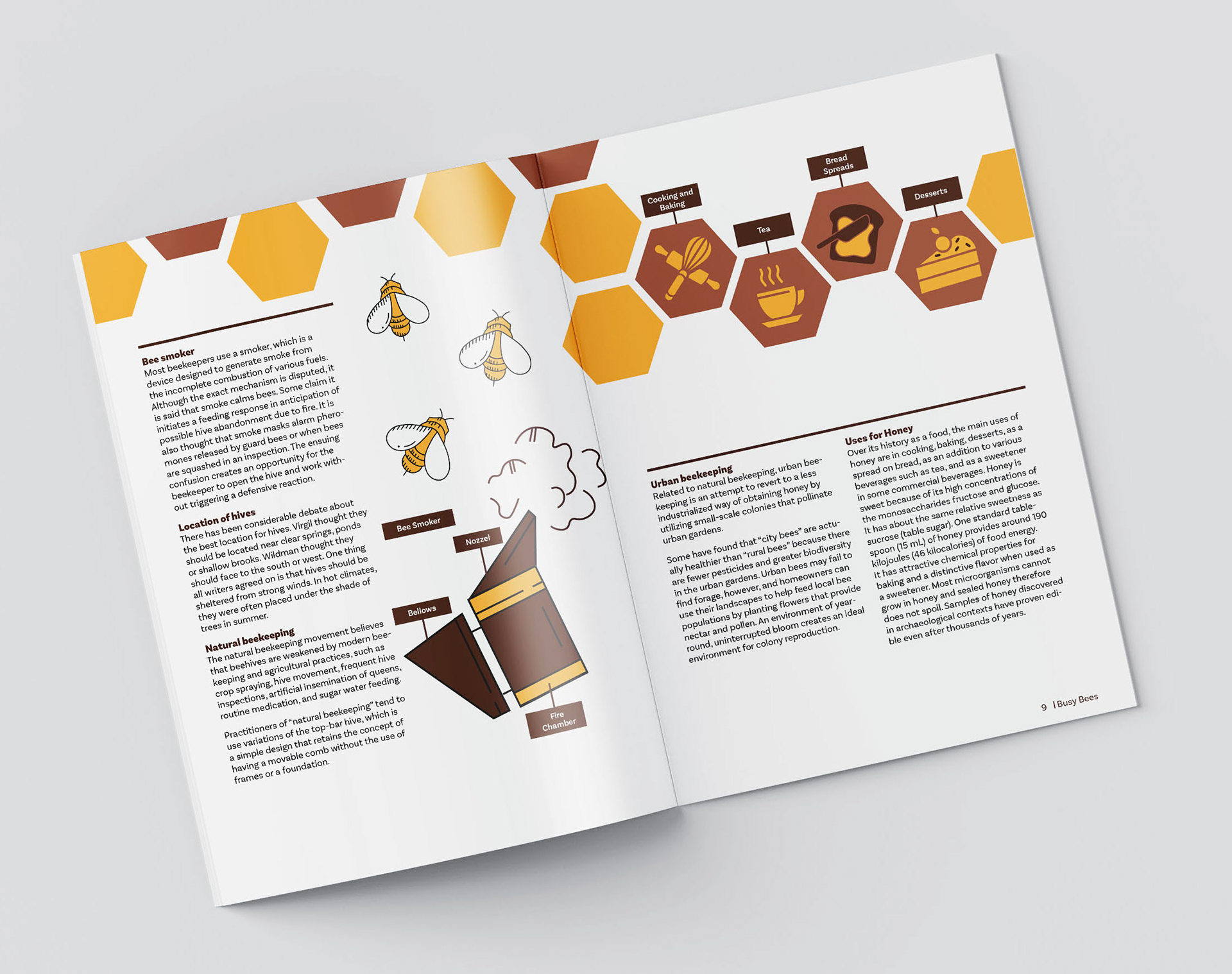 For this project, we were tasked to create a multi-page document/booklet focusing on beekeeping. The main target audience for this booklet includes members of the public who express a keen interest in beekeeping without having established themselves as beekeepers. We first started by analyzing the text and creating graphic imagery to help viewers understand the text more. After we chose a grid to work with, I decided to do a 4x8 module grid; this grid helps give a more organized and cohesive look to the spreads.