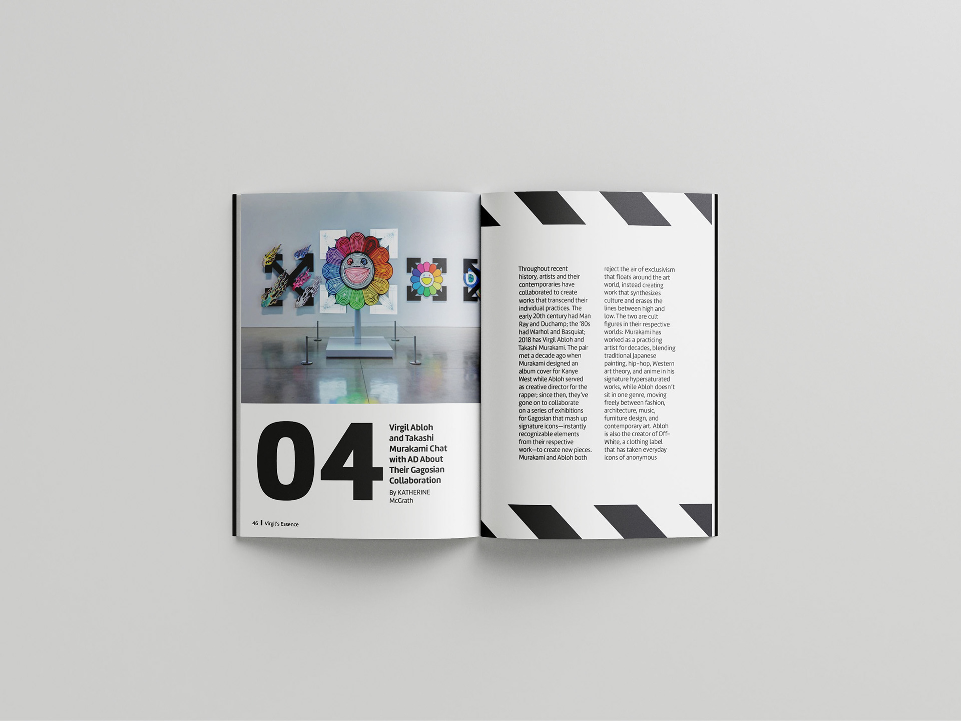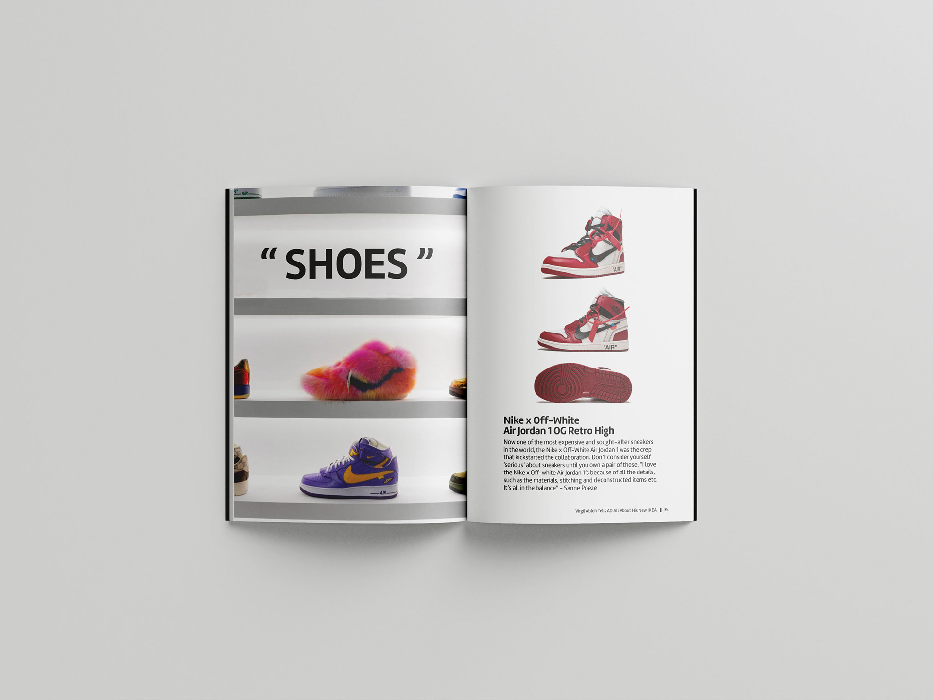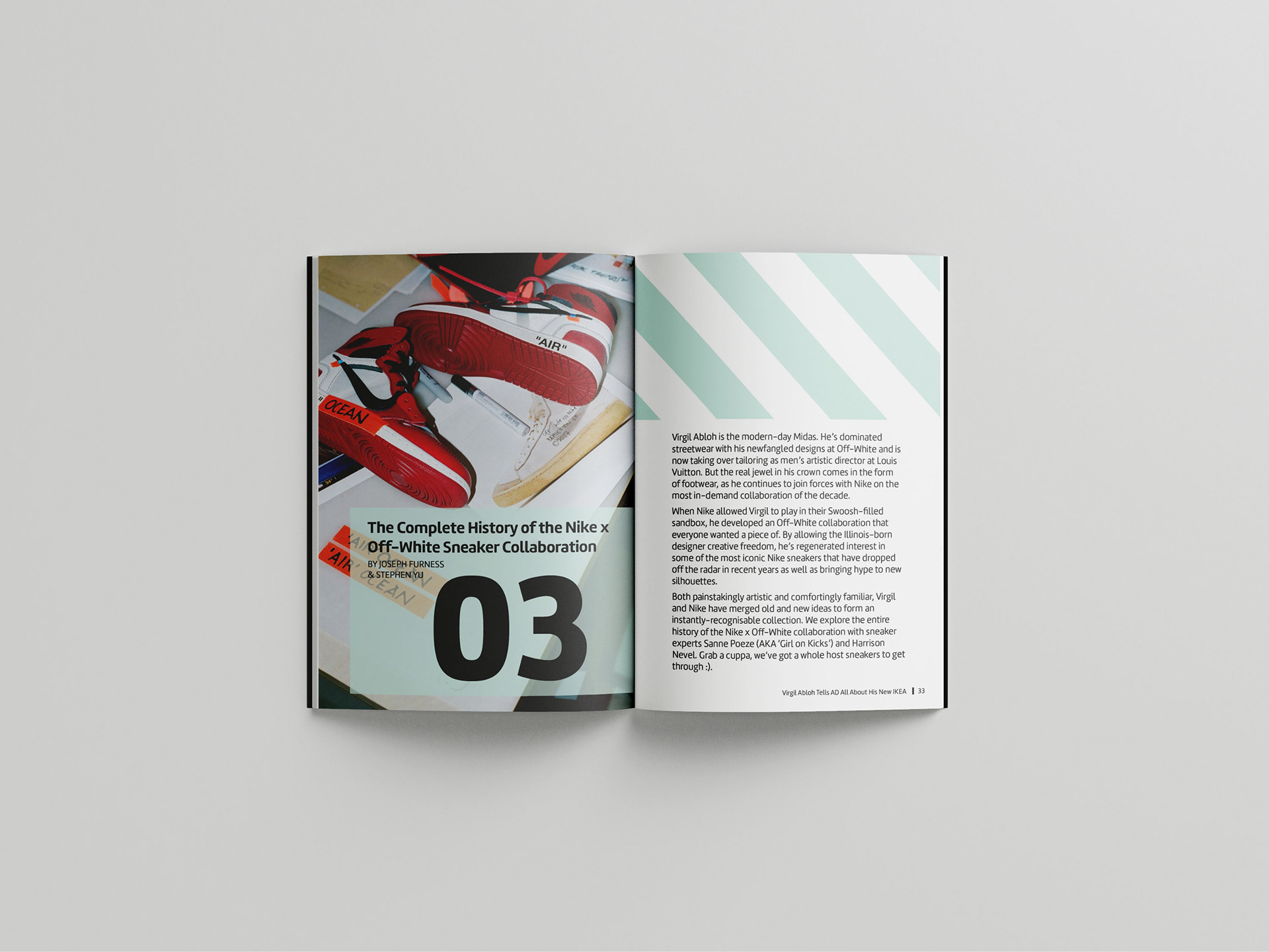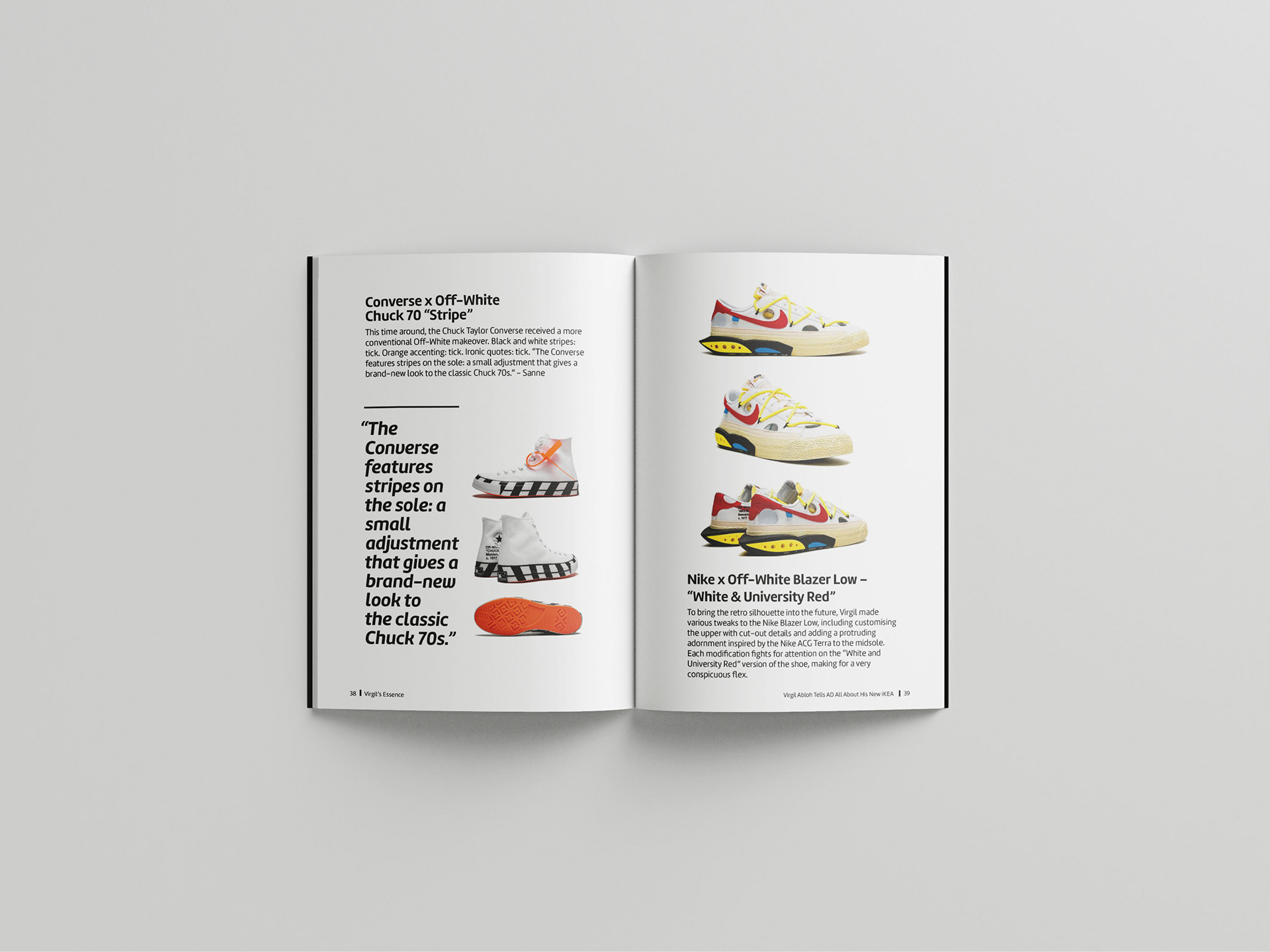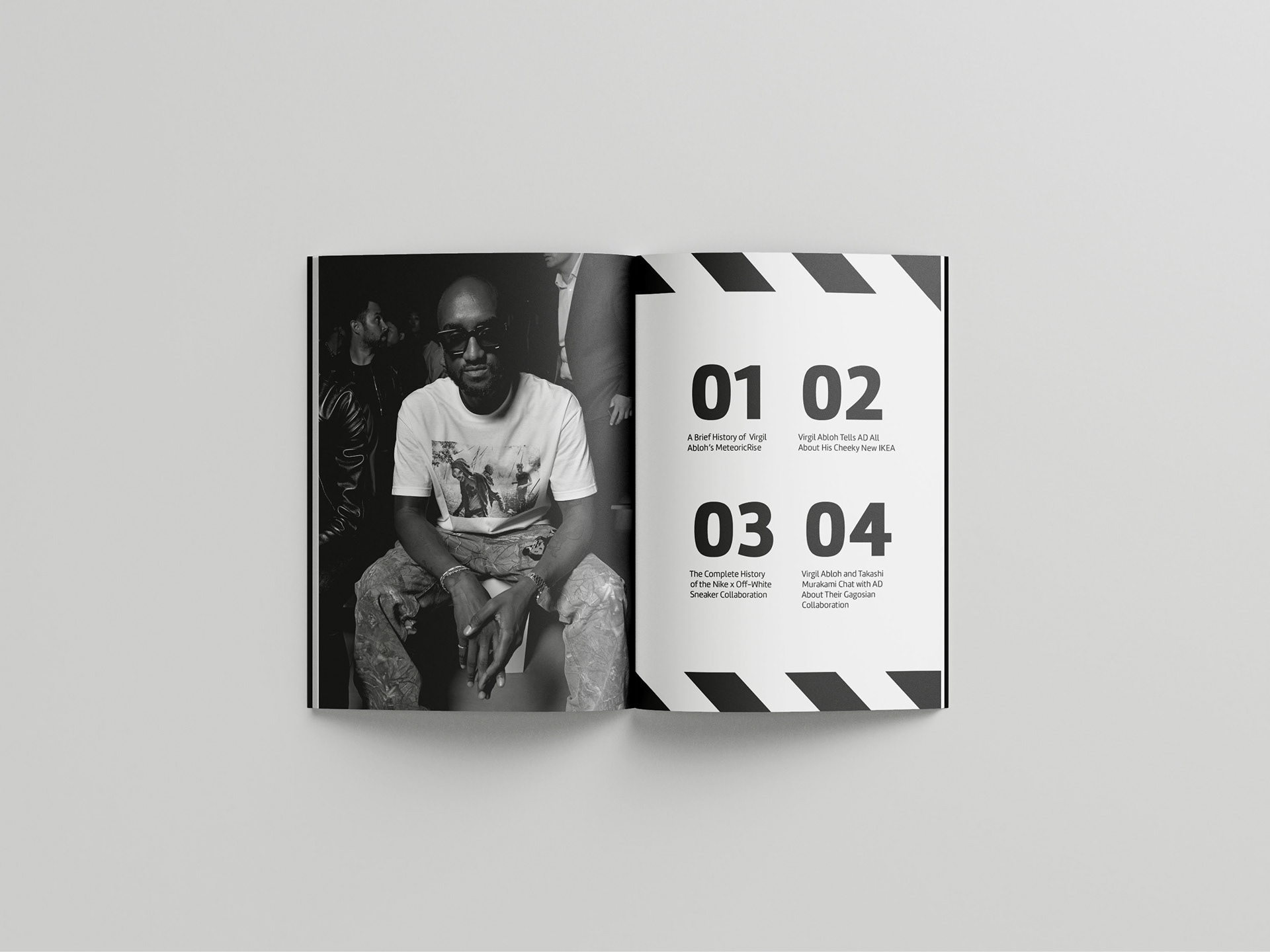 I focused on the details of typography and the creation of typographic systems. I learned to examine to examine the details of typesetting, how to manage and typeset large amounts of text and explore the basic principles of page design and layout. For this book, I chose to base it on the designer Virgil Abloh. I found multiple articles that talk about his collaboration with other brands as texts for this book.